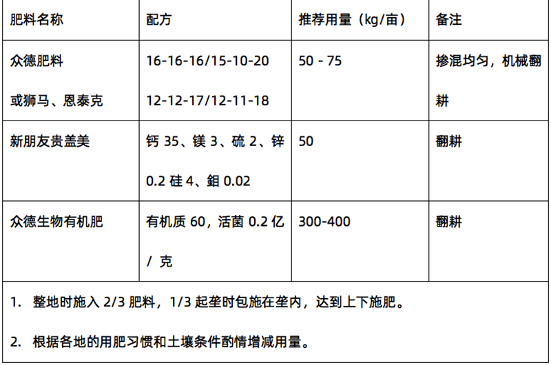 (2)推薦施肥套餐(根據目標產量、地域、品種、地力等適當調整)