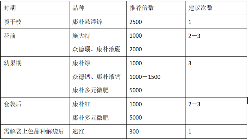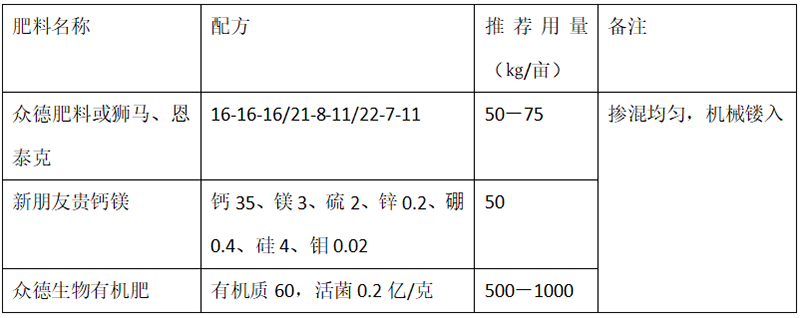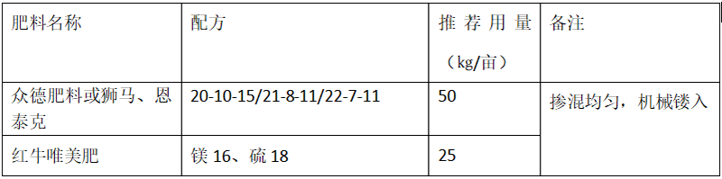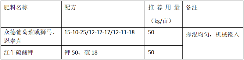 (2)推薦施肥套餐(根據(jù)目標(biāo)產(chǎn)量、地域、品種、樹勢、樹齡、地力等適當(dāng)調(diào)整)