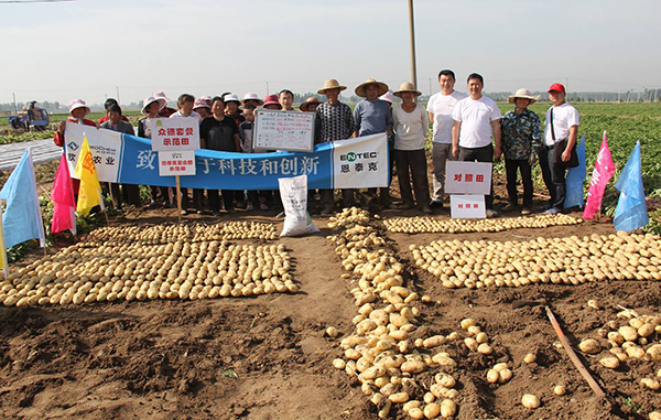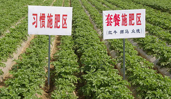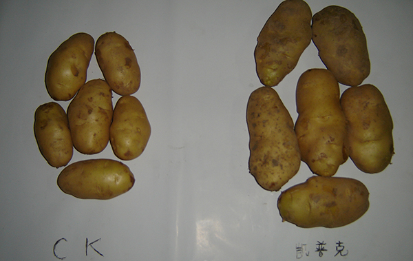 河南鄭州市滎陽高村農(nóng)民黃海望,共種6畝馬鈴薯,其中5畝用的眾德套餐,眾德生物有機(jī)肥80公斤,15-10-20高鉀型眾德牌摻混肥100斤在翻地前施用,100斤15-10-20高鉀型眾德牌摻混肥種肥同播,出苗后用態(tài)康科250倍液噴施兩次,另外一畝做對(duì)照,同等有機(jī)肥,100公斤15-15-15含量的復(fù)合肥作底肥。施用眾德牌摻混肥的馬鈴薯莖葉不旺長,發(fā)根早、根粗、苗壯,中期苗高比對(duì)照高15-20厘米,長勢(shì)好、病害少,收獲時(shí)馬鈴薯個(gè)頭大、品質(zhì)好、表面光滑,上市早,賣價(jià)高,產(chǎn)量比對(duì)照高58-60%,畝產(chǎn)達(dá)到6100多斤。